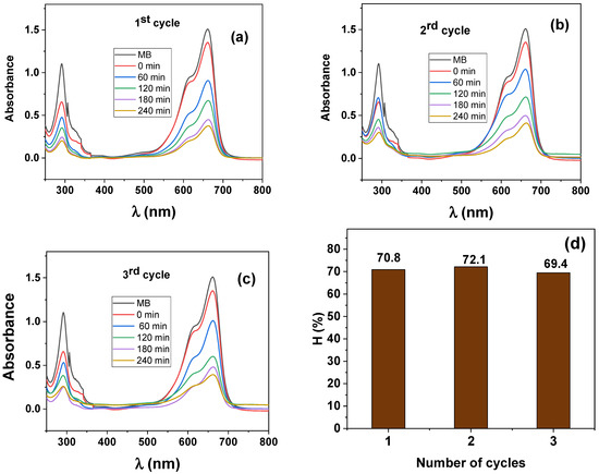 To study the recyclability of the photocatalysts, the used 5% CuO/STO/MWCNTs nanocomposites were collected, washed, and dried at 100 °C for 4 h in preparation for reuse. Afterward, the 5% CuO/STO/MWCNTs nanocomposites were recycled three times under similar reaction conditions. As demonstrated by Figure 12, the photocatalytic efficiency for the degradation of MB of the 5% CuO/STO/MWCNTs nanocomposites remain unaltered when the photocatalysts is recycled, and about 99.4% of the initial photocatalytic efficiency was maintained (as shown in Table 1 and Figure 12d).