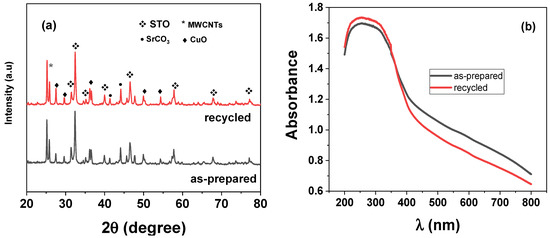 XRD patterns (a), DRS spectra (b) of the as-prepared and recycled 5% CuO/STO/MWCNTs nanocomposites.