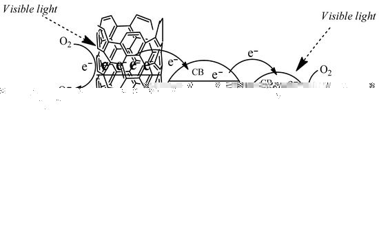 Based on the above analysis, for more profound understanding of the effect of CuO loading on the photocatalytic activity of the CuO/STO/MWCNTs photocatalyst for dye degradation under visible light, a possible mechanism has been developed, as shown in Figure 16 [42,43,44]. Under visible light irradiation, MWCNTs and CuO absorb visible light and the electrons were excited, thereupon generating the photogenerated electrons and holes. The photogenerated electrons on the MWCNTs transfer to the surface of the CuO nanoparticles through STO or directly. Furthermore, the electrons of the VB of STO were induced into MWCNTs, and the positive holes were left in the VB of STO. In other words, the charge of MWCNTs was positive in removing electrons from the VB of the STO to form holes in the VB of STO. The holes on the VB of STO transferred to the VB of CuO or reacted with the water molecules and/or MB dye to generate the hydroxyl radicals, which were reactive enough to result in the photodegradation of MB [45,46].