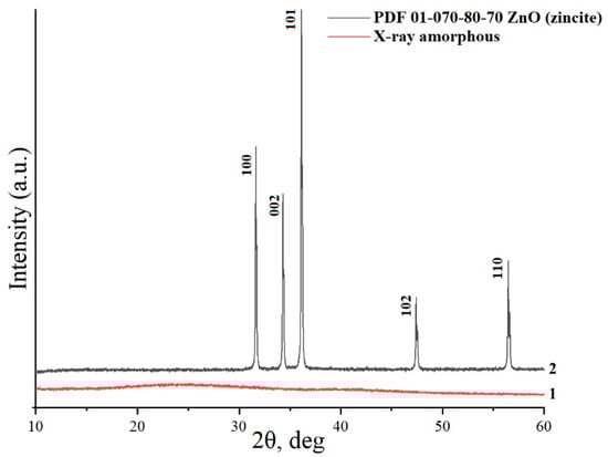 The method for obtaining finely dispersed ZnO powder is based on the technology discussed in detail [44,45]. Crystalline Zn(NO3)2•6H2O (85 g, special quality grade (Russian State Standard), Unikhim, Russia) was added in portions with vigorous stirring to a boiling aqueous solution of carbohydrate obtained by dissolving 50 g of D-glucose in 200 mL of distilled water until a brown viscous substance formed. Subsequent heating at a heating rate of 5 °C/min with holding at temperatures of 350 °C and 800 °C for 1 h made it possible to obtain finely dispersed nanosized ZnO powder.
