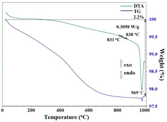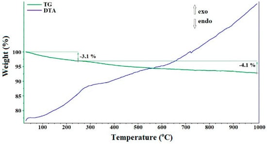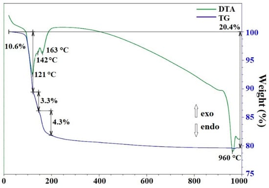 According to the X-ray powder diffraction (Figure 5), hydrothermal treatment of the suspension obtained when sample 1 was allowed to react with aqueous H3BO3 at 250 °C (τ = 72 h) leads to the formation of sample 4, consisting of phases of zinc borates ZnO•B2O3 and 4ZnO•3B2O3 (PDF 01-083-14-24 and PDF 00-004-06-31), zincite (ZnO) (PDF 01-070-80-70) and B(OH)3 sassolite (PDF 01-078-04-70), which is reflected in the IR spectrum (Figure 6). The IR spectrum of sample 4 is similar to the spectrum of sample 3, but there is some redistribution of bands in the region of 1500–400 cm−1. Broad bands of the OH stretching vibrations (3200 cm−1) and B–O stretching vibrations (1425 cm−1) are observed. A band corresponding to H–O–H bending vibrations shifts to 1194 cm−1. In the DTA/TG curves of sample 4 (Figure 7) in the range of 25–215 °C, there are low-temperature endothermic effects at 121 °C, 142 °C, and 163 °C with a total weight loss of 18.2 wt%, which correspond to the decomposition of B(OH)3 residues in sample 4. The endothermic effect in the range of 890–984 °C with a maximum at 960 °C corresponds to the melting point of zinc borate [12].