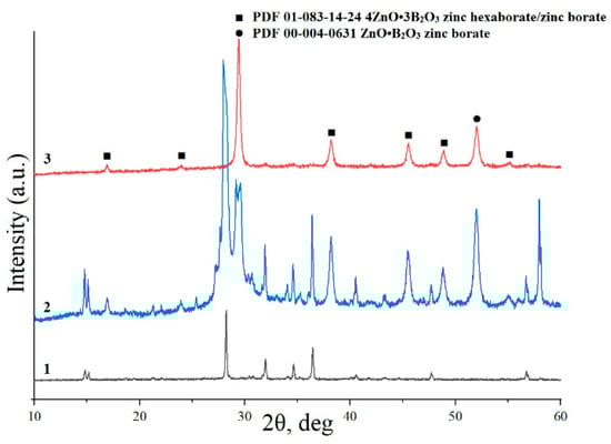 Zinc borates are a group of compounds based on Zn:B:O in their various molar ratios [11,12,13]. Hydrated (ZnO•B2O3•H2O, 2ZnO•3B2O3•7H2O, 2ZnO•3B2O3•3,5H2O, etc.) and anhydrous (ZnO•B2O3, 4ZnO•3B2O3, etc.) zinc borates are known [12], and are of technological interest as additives to polymer compositions due to their ability to slow down and suppress the processes of smoke formation [14,15,16,17]. In the production of paints with high anti-corrosion performance, a joint additive of zinc borate and phosphate bases is used [18,19]. Zinc borate compounds are used as anti-corrosion coatings on machined materials and surfaces [19]. The low toxicity and availability of zinc borates, along with resistance to elevated temperatures and open fire, are valuable properties and determine their widespread use as flame retardants [20], including when creating thermal protective clothing [21]. The dehydration temperature of the hydrated form of zinc borate (2ZnO•3B2O3•3,5H2O) is about 290 °C, which gives tangible advantages when mixed with plastics and rubbers at high temperatures (200–300 °C). At the same time, the anhydrous form of zinc borate allows mixing with plastics and rubbers without deteriorating their characteristics with more intense heating [14,17]. Zinc borate is able to interact with the synthetic component of rubbers, with polyvinyl chloride bases, as well as with substances of the polyurethane foam group, which leads to an increase in the parameters of the oxygen index of polymers [14,17]. In addition, zinc borate plays a role as a fungicide additive that slows down the growth of mold fungi, which is widely used in the manufacturing of building materials [22]. In addition, the preparation of glasses with different properties based on zinc borates is an urgent task of modern industry [23,24,25,26].