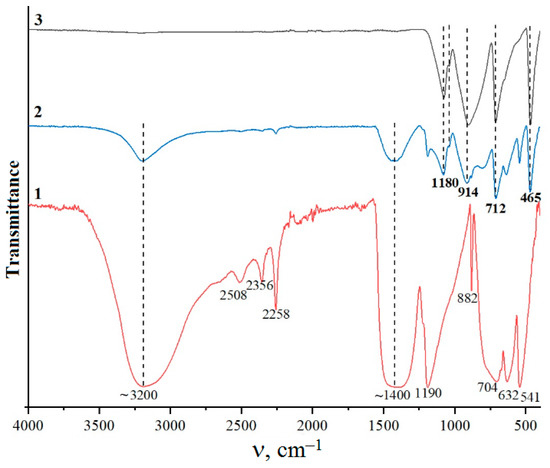 IR spectra of samples 3 (curve 1), 4 (curve 2), and 5 (curve 3).