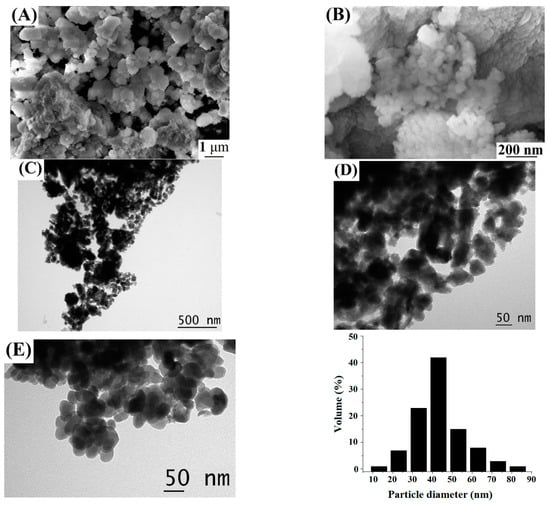 SEM (A,B) and TEM (C–E) images, and sample particle size distribution curve for sample 5.