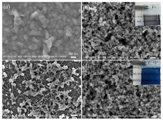 SEM images of (a) PPy film, (b) PPy@TiO2 film, (c) PEDOT film, and (d) PEDOT@TiO2 film (the inserted images in b, d are the photographs of PPy@TiO2 and PEDOT@TiO2 films, respectively).