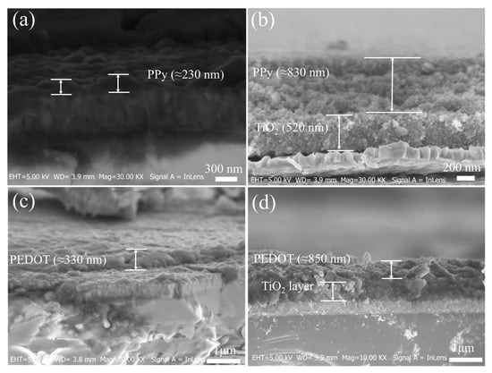 SEM images of cross-section of (a) PPy film (230 nm), (b) PPy@TiO2 film, (c) PEDOT film (330 nm), and (d) PEDOT@TiO2 film.