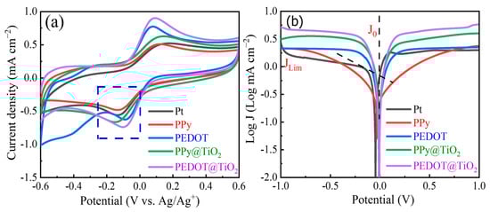 (a) Cyclic voltammograms for the redox reaction of [Co(bpy)3]2+/3+ and (b) Tafel polarization plots for the symmetrical cells with Pt, PPy, PEDOT, PPy@TiO2, and PEDOT@TiO2 CEs.