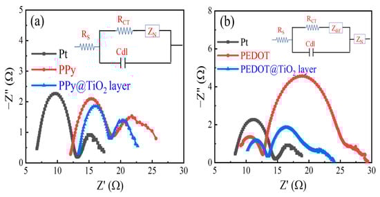 Nyquist plots of symmetric cells with (a) Pt, PPy, PEDOT, PPy@TiO2, and (b) Pt, PEDOT@TiO2 CEs (The inside upper is the equivalent circuit used for fitting the Nyquist plots).