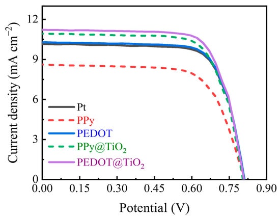 Photocurrent–voltage (J–V) curves of DSSCs with various counter electrodes.