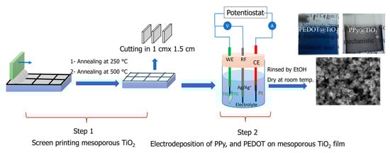 For PPy, the base electrodeposition solution consisted of 10 mM of pyrrole, 10 mM concentrated H2SO4, 100 mM LiTFSI, and 10 mM SDS in 20 mL DI water; the mixture was treated using ultrasonication for 30 min. Electrodeposition was performed at 0.75 V for 30 s. The electrodeposited electrodes were rinsed with absolute ethanol and dried in the atmosphere at room temperature. The whole process utilized to prepare the electrodeposited electrodes is presented in Figure 7. For comparison, the pristine PEDOT PPy CEs were prepared using similar methods as the PPy@TiO2 electrode. Furthermore, for compression, Pt CEs were prepared by the thermal decomposition of 10 mM of H2PtCl6 in ethanol at 380 °C for 30 min [1].