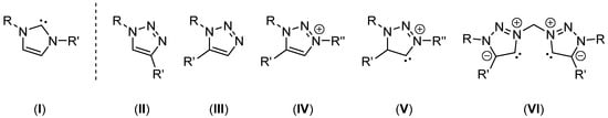 Triazoles have become important and frequently used tools in modern coordination chemistry. Both regioisomers exhibit diverse coordination sites before and after deprotonation of the acidic C-H bond in the heterocycle (resulting in a triazolide ligand) [8]. Triazoles can further be alkylated at a nitrogen position (preferably at N3) to yield triazolium salts [9]. The triazolium salts conserve the acidity of the C-H moiety in the heterocycle and yield triazolylidenes upon deprotonation [8,9]. Triazolylidenes are, for obvious reasons, more commonly called mesoionic carbenes (MICs) since no localized structure of these compounds can be drawn without showing a charge separation [10]. An overview of the structures of N-heterocyclic carbenes with a C-centered coordination site and the triazole and triazolium precursors is shown in Figure 1.