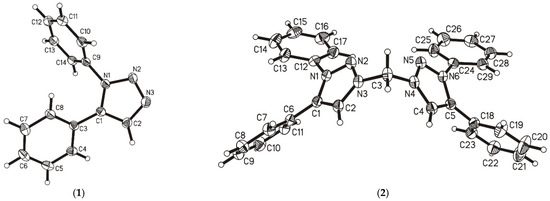 We mounted 1,5-Diphenyl-1H-1,2,3-triazole (1) on LithoLoops produced by Molecular Dimensions fixed on pins produced by Hampton Research. Data was recorded at 100 K on an XtaLAB Synergy diffractometer from Rigaku with a mirror monochromated Cu-Kα-radiation (λ = 1.54184 Å). As detector, a Hybrid Pixel Array Detector (HyPix) was used. Moreover, 3,3′-Methylenebis(1,5-diphenyl-1H-1,2,3-triazol-3-ium) triflate (2) and [Mo(CO)4(bta)] (3) were mounted on a glass fiber in inert paraffin oil. Data were recorded at 170 K on a STOE-IPDS 2T diffractometer with graphite-monochromated Mo-Kα-radiation (λ = 0.71073 Å). Absorption corrections were performed using X-Red32 and X-Shape (by STOE & Cie GmbH 2010) in case of the Mo source or CrysAlisPro 1.171.42.61a (Rigaku OD, 2022) in the case of the Cu source. All of the structures were solved by direct methods (SHELXS-2013 or SHELXT-2016) and refined by full-matrix least-squares techniques using the SHELXL executable and the WingX GUI [76,77,78]. All non-hydrogen-atoms were refined with anisotropic displacement parameters. Unless stated otherwise, all hydrogen atoms were refined isotropically at calculated positions using a riding model with their Uiso values constrained to 1.2 times Ueq of their pivot atoms for aromatic or to 1.5 times Ueq for all other carbon atoms. For 1, all hydrogen atoms were refined freely. For 2, all non-aromatic hydrogen atoms were refined freely. General crystallographic, crystal and refinement data for 1, 2 and 3 are provided in the supplementary data file (Tables S2–S4). Crystallographic data were deposited with the Cambridge Crystallographic Data Centre, CCDC, 12 Union Road, Cambridge CB21EZ, UK. These data can be obtained free of charge on quoting the depository numbers CCDC 2215829 (3), 2215830 (1), and 2215831 (2) by FAX (+44-1223-336-033), email (deposit@ccdc.cam.ac.uk) or their web interface (at http://www.ccdc.cam.ac.uk).
