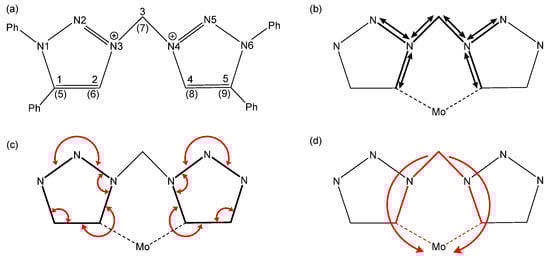 Schematic representation of the observed changes in bond distances (black arrows) and angles (red arrows) of the bistriazolium (2) and the molybdenum coordinated bistriazolylidene (3) moieties. (a): Labels of the bistriazolium and the coordinated bistriazolylidene (in brackets, where deviating). (b): significantly shortened bond lengths after coordination. (c): significantly changed angles. (d): Changes in the torsion angle in a butterfly kind of motion through coordination with molybdenum.