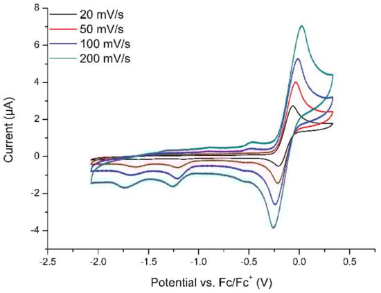 Cyclic voltammograms of 3 in CH3CN using 0.1 M nBu4NPF6 as supporting electrolyte at different scan rates under an argon atmosphere measured at room temperature.