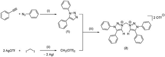 Reaction scheme for the known syntheses of 1,5-diphenyl-1H-1,2,3-triazole (1) and 3,3′-methylenebis(1,5-diphenyl-1H-1,2,3-triazol-3-ium) triflate (2). (i): KOH, abs. DMSO. (ii): RT, n-hexane, dark. (iii): Reflux, mixed toluene/n-hexane, dark [5,11].