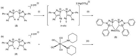 To enforce the coordination of the chosen bistriazolylidene ligand, various reaction conditions and procedures were tested, and reaction progress monitored by a thin layer chromatography. A deprotonation strategy using strong bases such as potassium hydride, potassium bis(trimethylsilyl)amide (KHMDS) or N-isopropylamine (DIPEA) and subsequent in-situ coordination with preactivated complexes such as [Mo(CO)5(thf)], [Mo(CO)4(MeCN)2] or [Mo(CO)4(piperidine)2] proved unsuccessful [46,47,48,49]. Neither the isolation of the free carbene prior to coordination nor the isolation of its trapped selenone form for characterization purposes was possible. However, coordination could be achieved by i) following a literature known transmetalation reaction from an in-situ prepared silver complex (Scheme 2a) [50] or (ii)) using a metal complex with basic and labile ligands (Scheme 2b). The latter is essentially an adaptation of the use of basic metal precursors such as Pd(OAc)2 or [Pd(acac)2] reported throughout the literature [51,52,53,54].