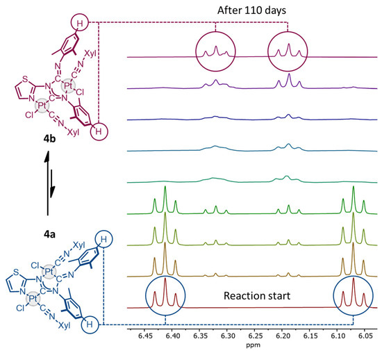 As in the case of binuclear palladium complexes [35], for platinum(II), the kinetically controlled regioisomer transforms over time into the thermodynamically controlled one. However, in contrast to the palladium congeners, the isomerization of 4a under similar conditions (CDCl3, 45 °C) took much longer: 110 days for the Pt(II) species vs. 14 days for the Pd(II) species (Figure 1).