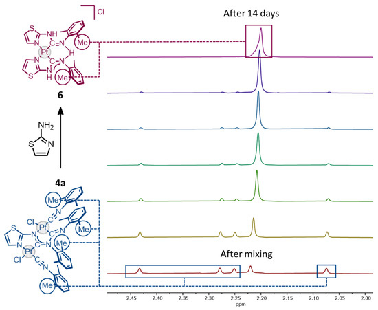 While studying the reaction mixture with the 5:1 ratio of 2 and 1, we observed changes in the signals’ intensities over time. Thus, the intensity of Me-groups’ peaks from bis-carbene 6 increased, while those from binuclear species 4a concurrently decreased. After two weeks at RT, we did not observe any signals from 4a, while the reaction mixture remained homogeneous (Figure 2).