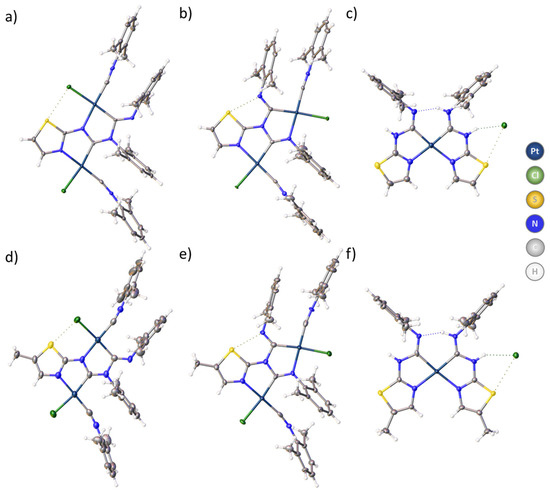 Views of crystal structures of complexes: 4a (a), 4b (b), 6 (c), 5a (d), 5b (e), 7 (f). Dotted lines indicate S···Cl, S···N, H···Cl and H···N noncovalent interactions.