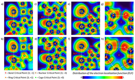 Visualization of the electron localization function (ELF), QTAIM bond critical point (BCP), and bond paths (white lines) corresponding S···Cl chalcogen bonds in structures of 4a (a) and 4b (b), S···N chalcogen bonds in structures of 5a (c) and 5b (d), bifurcated chalcogen-hydrogen bonds μ(S,N−H)Cl in structures of 6 (e) and 7 (f), and N–H···N hydrogen bonds in structures of 6 (g) and 7 (h).
