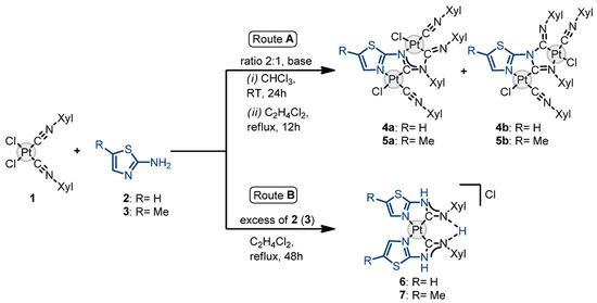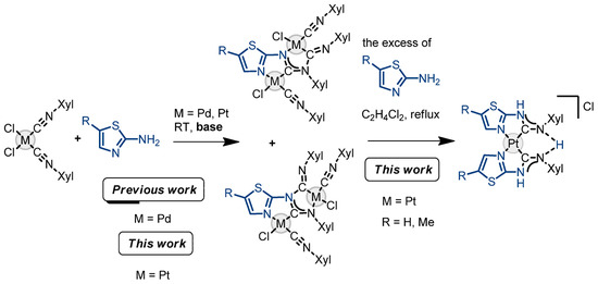 Previously, we reported [35,36] that the treatment of cis-[PdCl2(XylNC)2] with thiazol-2-amine leads to a regioisomeric mixture of two binuclear complexes (Scheme 1), one of which proved to be kinetically controlled, while the generation of the other one is thermodynamically driven. In many instances, platinum(II) complexes exhibit similar reactivity as their palladium(II) congeners, although the former species are typically substantially more kinetically inert. This inertness is often used for the tapping and identification of those reaction intermediates that are elusive or quite unstable when relevant palladium(II) species are employed. To get a deeper insight into the mechanism of the reported coupling, for this work we addressed the platinum(II) complex cis-[PtCl2(XylNC)2] and studied its reaction with thiazol-2-amines.