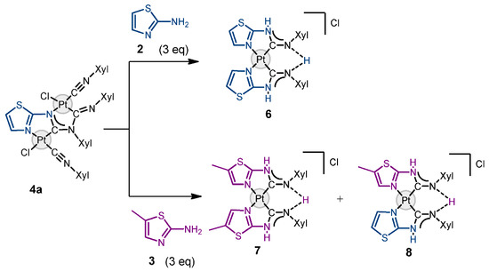 We assumed that in an excess of 2, binuclear species 4a could transform into bis-carbene 6. To prove this hypothesis, we performed the isolation of binuclear complex 4a and then carried out its reaction with three equiv. of 2. As expected, this reaction yielded bis-carbene 6. Furthermore, we performed a cross-experiment comprising of the addition of three equiv. of another nucleophile, 5-methylthiazol-2-amine 3, to complex 4a. This experiment verified the generation of two bis-carbene complexes 7 and 8, both identified in the reaction mixture by 1H NMR and HRESI-MS (Scheme 3).