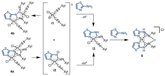 Considering the results of our experiments, we propose the following mechanism for the formation of 6 (Scheme 4). In the first stage, binuclear complex 4a may proceed dissociation into cationic bis-isocyanide intermediate i1 and anionic monocarbene complex i2, which can recombine into isomeric binuclear complex 4b. However, in the presence of 2 acting as a nucleophile and a proton donor, each of these species can transform into monocarbene intermediate i3. The latter reacts with one more equiv. of thiazol-2-amine to eventually provide bis-carbene 6.