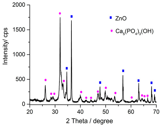 Figure 1 presents the XRD pattern of the ZH powder and identification of crystalline phases. Two phases were identified: zincite, ZnO, (card no. 04-015-4060), with hexagonal crystallization, and hydroxyapatite, Ca5(PO4)3(OH) (card no. 01-079-5683), in a hexagonal crystallization system too. XRD analysis shows a well-defined peak at 2θ = 31.80° which is characteristic of (211) atomic plane diffraction of hydroxyl apatite. The peaks at 2θ of 36.5°, 56.8°, 34.59° are characteristic to ZnO crystals with preferential growth direction c. The well-defined peak at 36.5 is characteristic of (101) atomic plane diffraction of ZnO. In addition, the high intensity of the diffraction lines suggests the highly crystalline nature of the prepared powder.