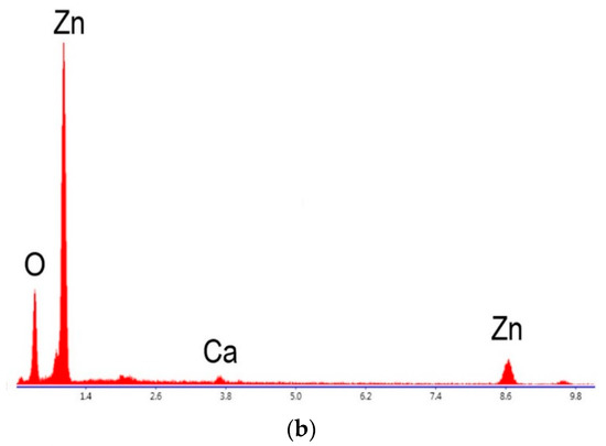 The morphology of the ZH powder was investigated with scanning electron microscopy (SEM), and the composition of the particles was evaluated by dispersive energy spectroscopy (EDS). The ZH powder was coated with a thin layer of gold for better conductivity. Figure 2a shows the SEM image of the powder and two types of crystals can be observed. Compositional identification of the two types of crystals was carried out using EDS, and the results are shown in Figure 2b,c and in Table 1. Some crystals were formed into rods with diameters about 3–4 µm and length of 10–20 µm. Other crystals show a cuboidal grain. The composition of the rods (point 1) is formed mainly in the elements Zn and O, and the composition of the grains consists predominantly of elements of hydroxyapatite (Ca, P, O). As can be seen from Figure 2 and Table 1, both types of crystals have zinc and calcium in their composition. There are two phases as can be seen in the XRD pattern: one rich in ZnO and one rich in hydroxyapatite. An optimum Ca/P ratio (1.79 at%) was recorded for hydroxyapatite crystals.