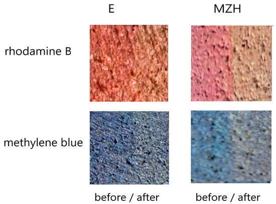 Images of self-cleaning result for plain cement mortar (E) and cement mortar with powder ZnO/Hap (MZH).