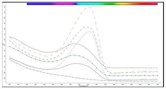 Figure 5 shows the spectra in the visible region for all measured areas, as in Table 2. The higher intensity of the dark areas and the lower intensity of the areas after photocatalysis are shown. In Figure 5, the x-axis represents the wavelengths in nm in the UV–Vis range, and the y-axis represents K/S. K represents the absorption coefficient and S is scattering coefficient, the value K/S is a measurement of surface color strength. The curve at the bottom of the plot without a band is the initial unstained MZH cement mortar (denoted as standard in Table 2). In the other spectra, the bands at around 550 nm are characteristic of the dye rhodamine B. The three measurements on the colored area (denoted as the dark area in Table 2) and three measurements on the UV exposed (photocatalysis) colored area (denoted as the bright area in Table 2) were performed. This is also confirmed by the wavelength shift from approximately 520 nm in the bright area (toward green) to approximately 555 nm in the dark area (toward red). The results confirm the self-cleaning properties.