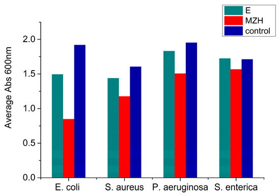 The results of planktonic growth demonstrated that the cement mortars showed different antimicrobial effects, depending on their composition. Figure 6 shows the sensitivity of some strains of bacteria to the action of cement mortars. The study revealed that, after 24 h of incubation, the planktonic growth of the E. coli strain is significantly inhibited in the presence of cement mortar MZH, compared to the control strain. An inhibitory activity was observed for cement mortar MZH on S. aureus, P. aeruginosa, and S. enterica. Plain cement mortar E has the best growth inhibitory activity for E. coli. In all tests, the MZH cement mortar (with zinc oxide/hydroxyapatite powder inside) inhibited the growth of bacterial strains more than the plain cement mortar E.