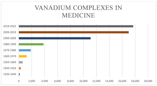Similar to other transition metal complexes, such as copper [16], gold [17], iron [18], and zinc [19], vanadium complexes show a wide range of bioactivities. The interest in vanadium complexes in medicine started earlier than 1939 and rose gradually until the 1970s [11]. The number of published articles related to the promise of vanadium compounds/complexes in various therapeutic applications, including diabetes, microbial infections, and cancers, has increased rapidly since 1999 (Figure 1), which is mostly attributed to vanadium’s biological properties, many of which are shared with phosphates [20]. A recent study showed that vanadium (and its complexes with inorganic and organic ligands) plays an important role in lipid, DNA and protein synthesis, glucose transport and metabolism, and insulin-mimetic activity, and has mitogenic effects on different types of cells. It also shows therapeutic potential against RNA viruses including COVID-19 [21]. A series of in vitro investigations have demonstrated that oxidovanadium VO2+ and vanadate VO43− decrease lipolysis and stimulate glucose oxidation, glycogen synthase, glucose transport, and tyrosine phosphorylation in rat adipocytes [22]. Vanadates also promote glycogen synthase glucose uptake, glucose, and glycolysis oxidation in striated muscle [23,24]. However, vanadium is a highly toxic element that inhibits some biochemical processes.