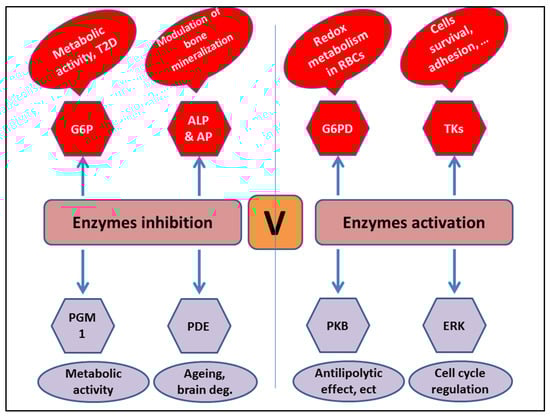 Conversely, vanadium can inhibit several enzymes, such as alkaline phosphatase (ALP) and acid phosphatase (AP), both of which are involved in bone mineralization [36,37], as well as glucose-6-phosphatase (G6P) [38,39], phosphodiesterases [40,41], and phosphoglucomutase [42,43] (Figure 2). Together, these findings suggest that vanadium complexes control numerous biological processes.
