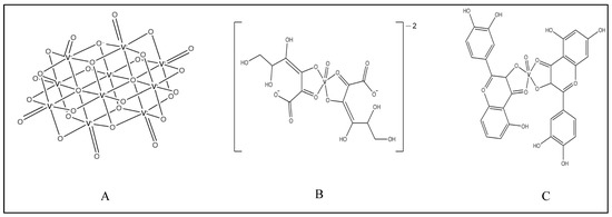 Structures of vanadium complexes of (A) decavanadate, (B) 2,3-diketogulonic acid, and (C) quercetin.