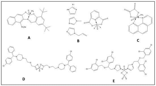 Imidazole derivatives have remarkable pharmaceutical potencies. They can bind to DNA and proteins with multiple modes of interaction such as electrostatic, intercalation, and groove binding [98]. Basaleh et al. [99] used three imidazole derivatives to synthesize novel vanadyl-based drug complexes from clotrimazole (CTNZ), miconazole (MNZ), and pantoprazole (PNZ). The investigated complexes bind to DNA non-covalently, and the [VO(SO4)(MNZ)2] H2O complex (Figure 5E) has a promising binding constant. Remarkably, all obtained metal complexes strongly inhibited HepG-2 and human breast cancer (HCF-7) cell lines.