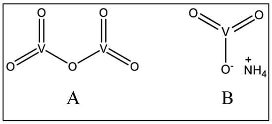 The fatal intoxication of ammonium vanadate (Figure 7B) has been documented [150] in a 24-year-old woman admitted to the emergency department and presenting several GI tract complications, including pain, nausea, vomiting, and diarrhea, as well as hypoglycemia and severe acute renal failure with glomerular filtration rate.