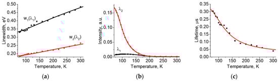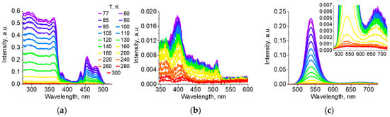 - Berezin, A.S.; Vinogradova, K.A.; Nadolinny, V.A.; Sukhikh, T.S.; Krivopalov, V.P.; Nikolaenkova, E.B.; Bushuev, M.B. Temperature- and excitation wavelength-dependent emission in a manganese(II) complex. Dalton Trans. 2018, 47, 1657–1665. [Google Scholar] [CrossRef]