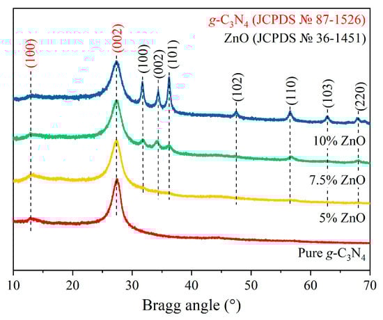 PXRD patterns of the initial g-C3N4, g-C3N4/ZnO (5% ZnO, 7.5% ZnO, and 10% ZnO) nanocomposites.