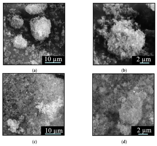 The microstructure of the obtained samples is studied using scanning electron microscopy. The pure g-C3N4 sample consists of randomly stacked layers consisting of inhomogeneously distributed and agglomerated structures (Figure 2a,b). In the sample containing 7.5% ZnO (Figure 2c,d), the nanolayers are randomly filled with oxide nanoparticles (NPs). Nanocomposite powders look less agglomerated and have a friable structure.