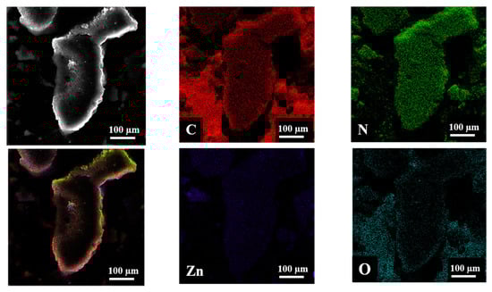 X-ray spectroscopy (EDX) elemental mapping results are shown in Figure 3. The elemental mapping results indicate the existence of C, N, Zn, and O elements suggesting that ZnO NPs disperse on the g-C3N4 sheets. A uniform distribution of C, N, Zn, and O atoms could be observed throughout each entire nanoplate.