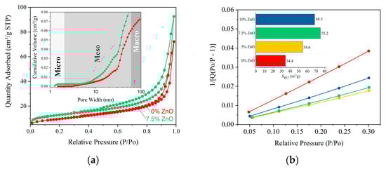 N2 adsorption-desorption isotherms of pure g-C3N4 and g-C3N4/7.5% ZnO were measured to gain information about the specific surface area (Figure 5a). According to the International Union of Pure and Applied Chemistry (IUPAC) classification, obtained isotherms were determined as type III with mesoporous characteristics, which indicates the mesoporous structure of the samples. The pore size distribution of the samples shows that most of the pores fall into the size range from 2 to 50 nm. The specific surface area values are shown in Figure 5b. The surface area for the resulting samples was calculated using the Brunauer–Emmet–Teller (BET) equation in the range of relative pressure (P/P0) 0.05–0.3. The specific surface area of the samples determined by the BET method is 34.4, 54.5, 75.2, and 68.5 m2/g for g-C3N4, g-C3N4/5% ZnO, g-C3N4/7.5% ZnO, and g-C3N4/10% ZnO, respectively. The optimal amount of oxide in the nanocomposite is 7.5 wt% ZnO, while further increase leads to a decrease in the values of the specific surface area. The surface of the composite samples will absorb more visible light, thereby increasing the photocatalytic efficiency by providing more active centers.