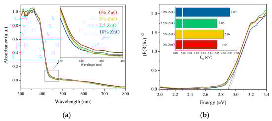 The UV–vis DRS of all samples is demonstrated in Figure 6a. It can be seen that the absorption of light by g-C3N4 is lower than that of other samples. When g-C3N4 is recombined with ZnO, the light absorption band edge undergoes a slight red shift. Such a modest change in the distance between the bands may indicate a tight contact at the interface with g-C3N4 and ZnO and confirms the synthesis of the nanocomposite. To further study the photocatalytic effect of the composites, a Tauc plot was derived from the UV-vis spectrum.