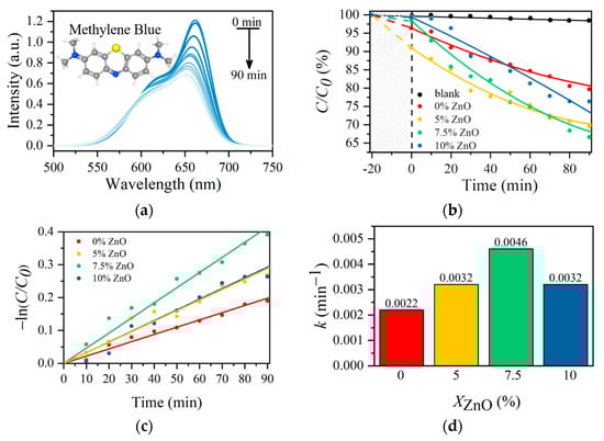 (a) Photocatalytic degradation of MB over g-C3N4/7.5% ZnO catalyst under visible light; (b) Kinetic curves, (c) Logarithmic kinetic curves of the pseudo-first-order process; (d) Photodecomposition rate constant versus ZnO content.