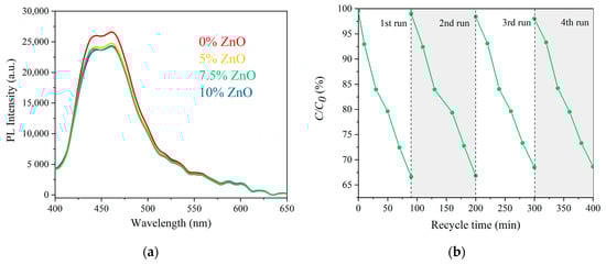 (a) PL spectra of initial g-C3N4 and g-C3N4/ZnO (5% ZnO, 7.5% ZnO and 10% ZnO) nanocomposites; (b) Recycling photocatalytic test of g-C3N4/7.5% ZnO.