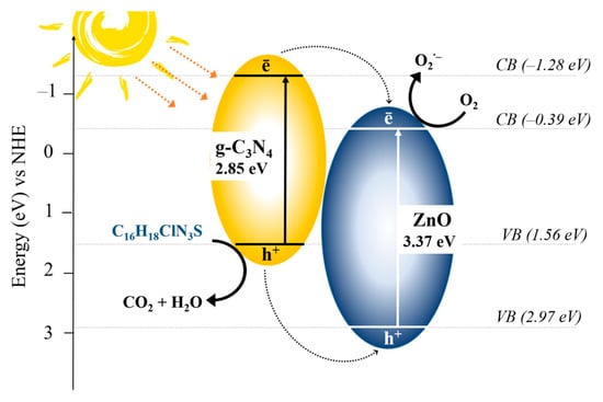 Figure 9 shows the mechanism of photocatalytic degradation of MB by g-C3N4/ZnO nanocomposites. ZnO has a band gap of about 3.37 eV [40,41] and cannot be excited by visible light. The spectrum of the g-C3N4/ZnO composite can be broadened to the visible region in contrast to pure ZnO. g-C3N4 is activated by sunlight, causing the electrons to shift from the valence band (VB) of each sample to the conduction band (CB) and create h+ on the VB of g-C3N4. These excited electrons are then transferred to the CB of ZnO, which further promoted it to the surface, leading to the generation of O2− radicals. The holes in the VB of ZnO are transferred to the VB of g-C3N4, which ensure effective charge separation in the system. These VB holes in g-C3N4 are further transferred to the surface to react with surrounding molecules and generate ·OH radicals [42,43]. In this way, these generated radicals are actively involved in the degradation of dye molecules.
