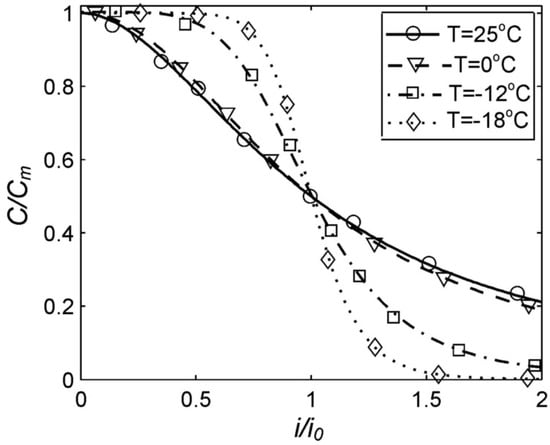 applies to any discharge currents [17,24,25,26]. In Equation (4), Cm is the top capacity of a battery, C(i0) = Cm/2, i.e., i0 is the discharge current, at which a battery released capacity is half the maximum capacity. Besides, for the Equation (4):