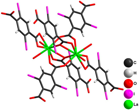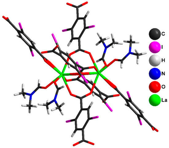 Structure of [La2(2,5-I-bdc)6(DMF)4] in the crystal structure of 2.