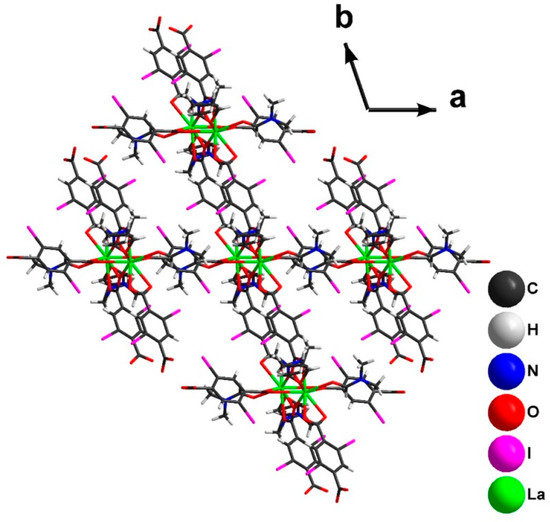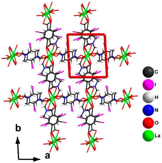 Layers formed by [La2(2,5-I-bdc)6(DMF)4] units in the crystal structure of 1.