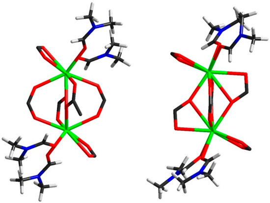 In the crystal structure of 2, the binuclear geometry of [La2(2,5-I-bdc)6(DMF)4] binuclear units is significantly different due to the absence of solvate DMF molecules. A comparison of the geometry of such dimers in the crystal structures of 1 and 2 is presented in Figure 4.